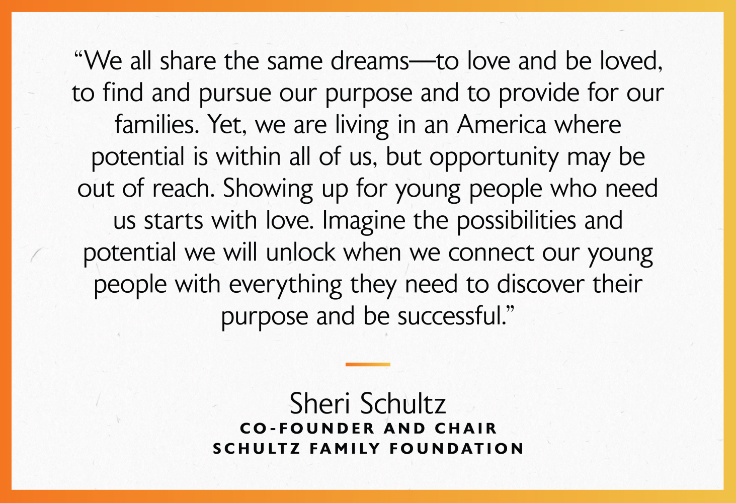 In the six months since I assumed leadership of the Schultz Family Foundation, our team has been hard at work clarifying how we will partner across sectors to make an enduring contribution that strengthens our country. As we embark on 2024, I am writing to update you on our vision and strategy that will guide our work in the years to come.